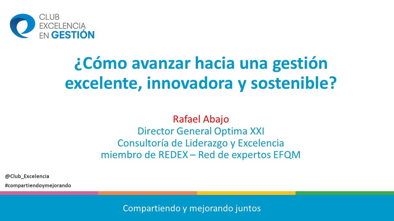 La siguiente presentación “¿Cómo avanzar hacia una gestión excelente, innovadora y sostenible?” corre a cargo de Rafael Abajo, Director General de ÓPTIMA XXI y miembro de la Red de expertos EFQM (REDEX), que centra su presentación en los pilares de la gestión excelente; innovadora y sostenible y es que, ahora más que nunca, los modelos de referencia nos ayudan a ser más ágiles, a adaptarnos a los cambios del entorno, a mejorar, a transformarnos… por eso es necesario adoptar en las organizaciones un enfoque integrador de la gestión, centrado en excelencia, innovación y sostenibilidad.