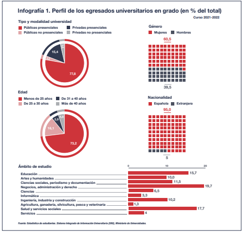 El segundo capítulo del Informe CYD 2023 analiza la interacción entre los graduados universitarios y el mercado laboral, abordando aspectos como la producción de egresados, su inserción laboral, el ajuste entre la oferta y la demanda de alta cualificación, la sobrecualificación y la formación continua. Además, se destaca la influencia potencial de la recién aprobada Ley Orgánica 2/2023 del Sistema Universitario en aspectos como la formación a lo largo de la vida y la conexión entre la oferta académica y las necesidades del mercado laboral.