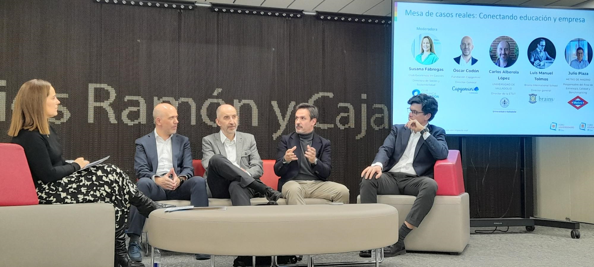 El encuentro se inició con una Mesa de diálogo: educación y empresa, una alianza con propósito en la que participaron: Carlos Alberola, Director de la Escuela Técnica Superior de Ingenieros de Telecomunicación (ETSIT) de la UNIVERSIDAD DE VALLADOLID, Luis Manuel Tolmos, Director general de BRAINS INTERNATIONAL SCHOOL, Julio Plaza, Responsable del Área de Estrategia, Calidad y Benchmarking de METRO DE MADRID y Oscar Codón, Director general de la FUNDACIÓN CAPGEMINI en la que se reunieron distintas miradas sobre la relación entre educación y empresa, subrayando la necesidad de crear alianzas que trasciendan lo formal para convertirse en motores reales de transformación. Los ponentes coincidieron en que solo a través de la colaboración activa y bidireccional se pueden formar profesionales preparados para los retos sociales y empresariales del futuro.