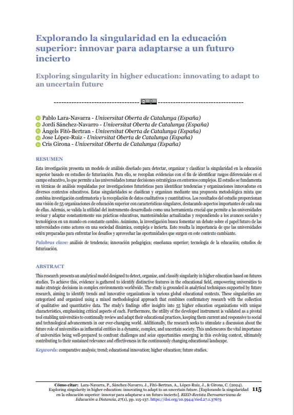 Este documento presenta un modelo de análisis diseñado para identificar, organizar y clasificar la singularidad en la educación superior mediante el uso de estudios de futurización. Al fundamentarse en técnicas respaldadas por investigaciones futurísticas, la investigación recopila evidencias para identificar rasgos diferenciales en el ámbito educativo, permitiendo a las universidades tomar decisiones estratégicas en entornos complejos.