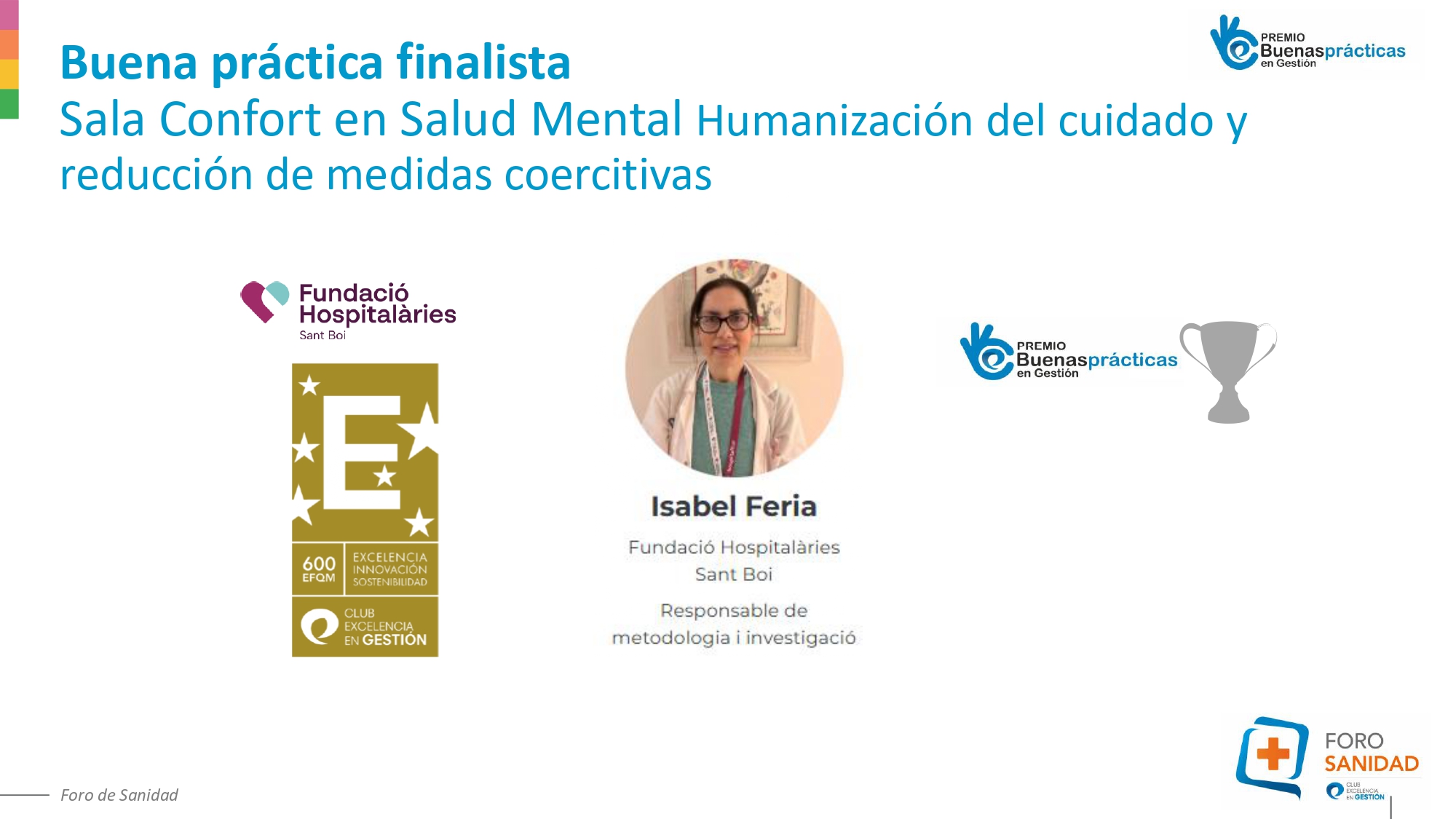 A continuación, Isabel Feria, responsable de metodología e investigación de la Fundación Hospitalarias Sant Boi presentó la Sala Confort en salud mental, una práctica centrada en la humanización del cuidado y en la reducción de medidas coercitivas. La iniciativa refuerza una atención más respetuosa, inclusiva y centrada en la persona.