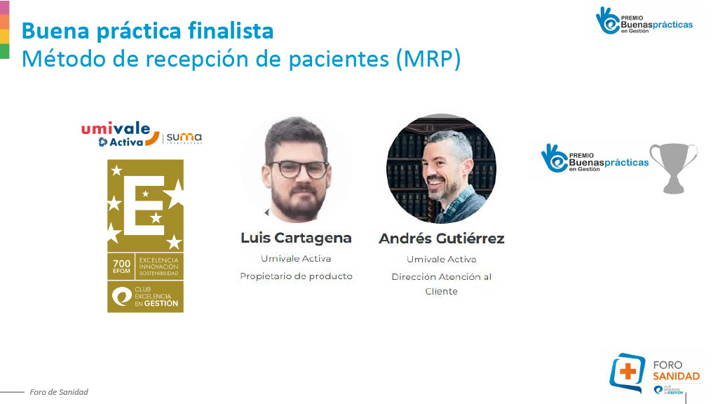Por último, Andrés Gutiérrez, de la dirección de atención al cliente y Luis Cartagena, propietario de producto de Umivale compartieron el Método de Recepción de Pacientes (MRP), orientado a estandarizar y automatizar la gestión de la primera asistencia médica. Este enfoque ha permitido mejorar la eficiencia, la trazabilidad y la experiencia de los distintos grupos de interés, con impacto en indicadores clave como el absentismo y la satisfacción .