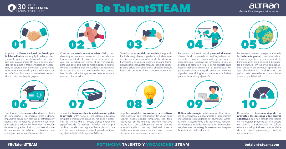 El cumplimiento de estos diez ‘mandamientos’ supondría, en opinión del Consejo Asesor de Be TalentSTEAM, el desarrollo de una economía basada en el conocimiento, con empresas competitivas que generen empleo de alto valor añadido, contribuyendo así a la construcción de un país que cree riqueza y sea capaz de distribuirla de forma equitativa.