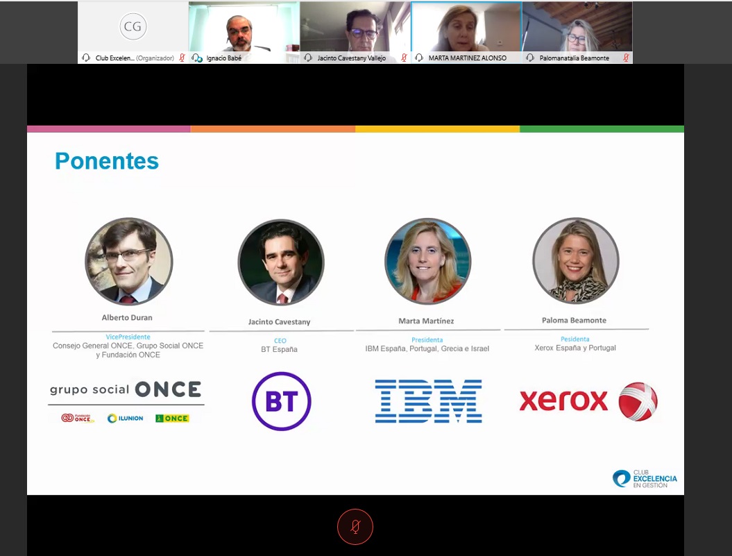 El Club Excelencia en Gestión ha celebrado la mesa redonda online ‘La salida del túnel de la crisis por el coronavirus, comentada por varios CEOs’, en la que han participado los principales representantes de cuatro empresas socias del Club: Marta Martínez, presidenta de IBM para España, Portugal, Grecia e Israel; Paloma Beamonte, presidenta de Xerox España y Portugal; Alberto Durán, vicepresidente del Grupo Social Once; y Jacinto Cavestany, CEO de BT España. El encuentro ha estado moderado por Ignacio Babé, CEO y secretario general del Club Excelencia en Gestión.