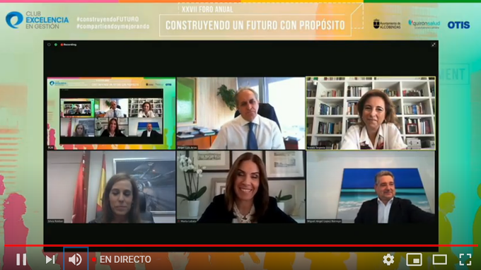 Ángel Alloza, secretario general y CEO de la Fundación Corporate Excellence, ha ofrecido una ponencia en la que ha expuesto fórmulas útiles para estructurar ese propósito. Tras su charla, ha tenido lugar una mesa redonda titulada Propósito y futuro, garantía de éxito a largo plazo, en la que han charlado: Ángel Luis Arias, director general de Enaire; Marta Labata, directora general de Barcelona Serveis Municipals; Miguel Ángel López, CEO de Siemens Spain y presidente de Siemens Gamesa; Silvia Roldán, CEO de Metro de Madrid; y Nieves Segovia, presidenta de la Institución Educativa SEK y nuevo miembro del consejo de la EFQM.