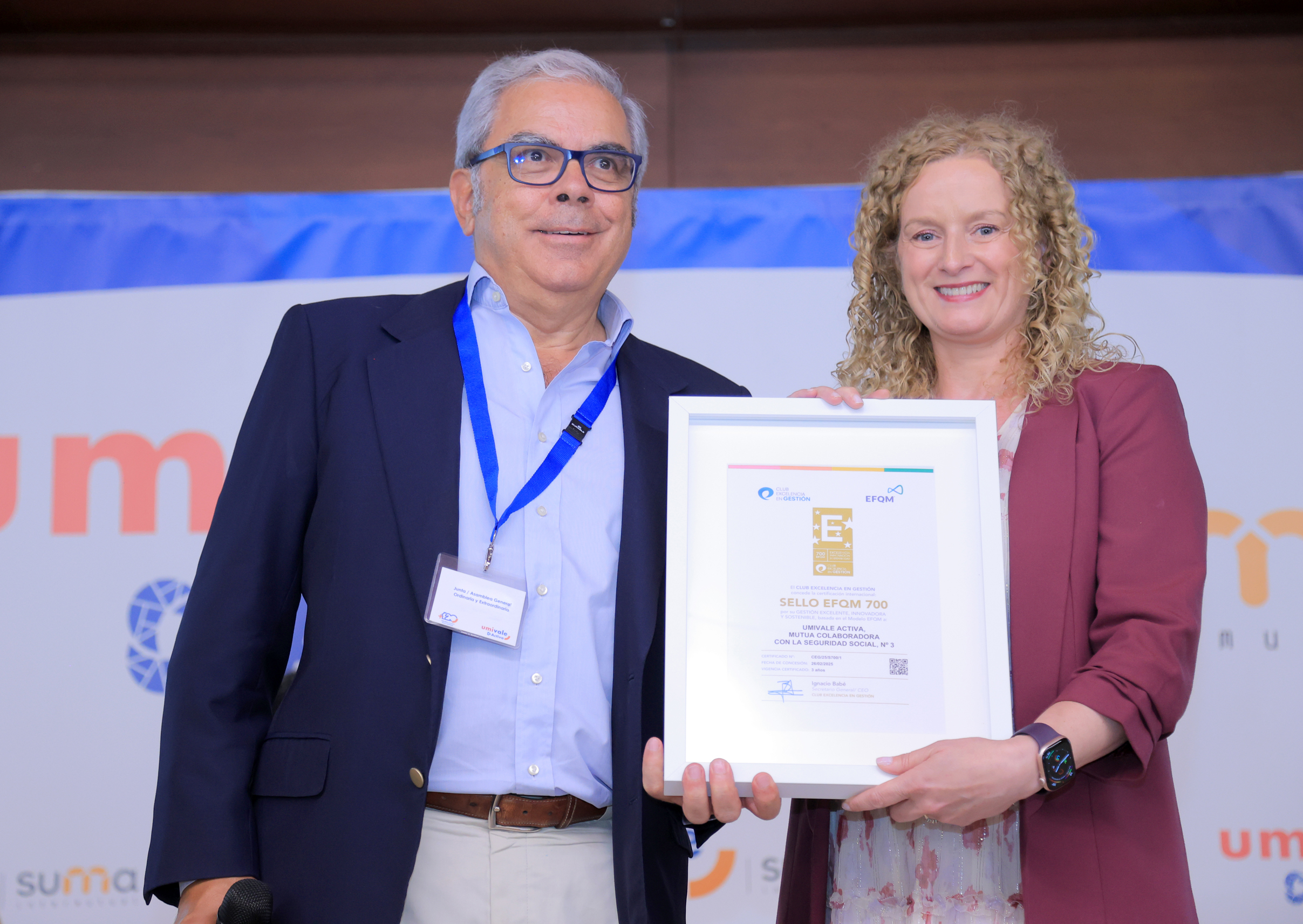 La presidenta de la mutua, Ana Benavides, recibió el Sello EFQM 700 de manos de Ignacio Babé, director general y CEO del Club Excelencia en Gestión, representante oficial de EFQM en España. Durante el acto, Benavides destacó: “En 2021 fuimos la primera entidad en España en obtenerlo y en la actualidad solo otras dos empresas han alcanzado este reconocimiento. Como comprenderéis, para nosotros es un orgullo estar entre las empresas líderes en Excelencia en Europa.”